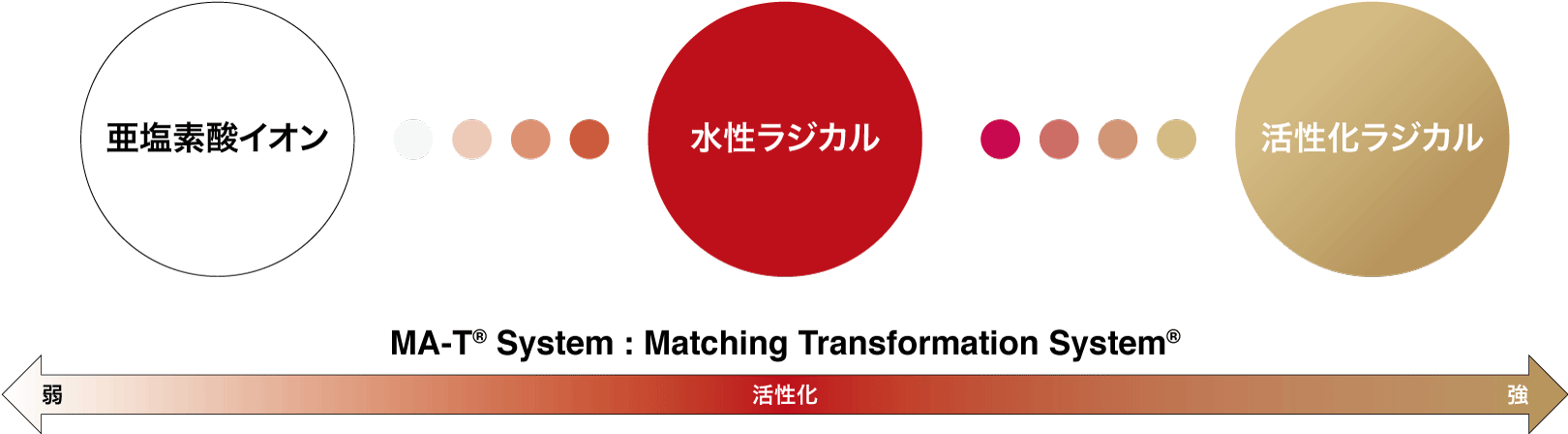 亜塩素酸イオンから必要な時に、必要な量の活性種(水性ラジカル)を生成させることで、流行性ウィルスをはじめとするウイルスの不活化、種々の菌(細菌)の除菌を可能にします。